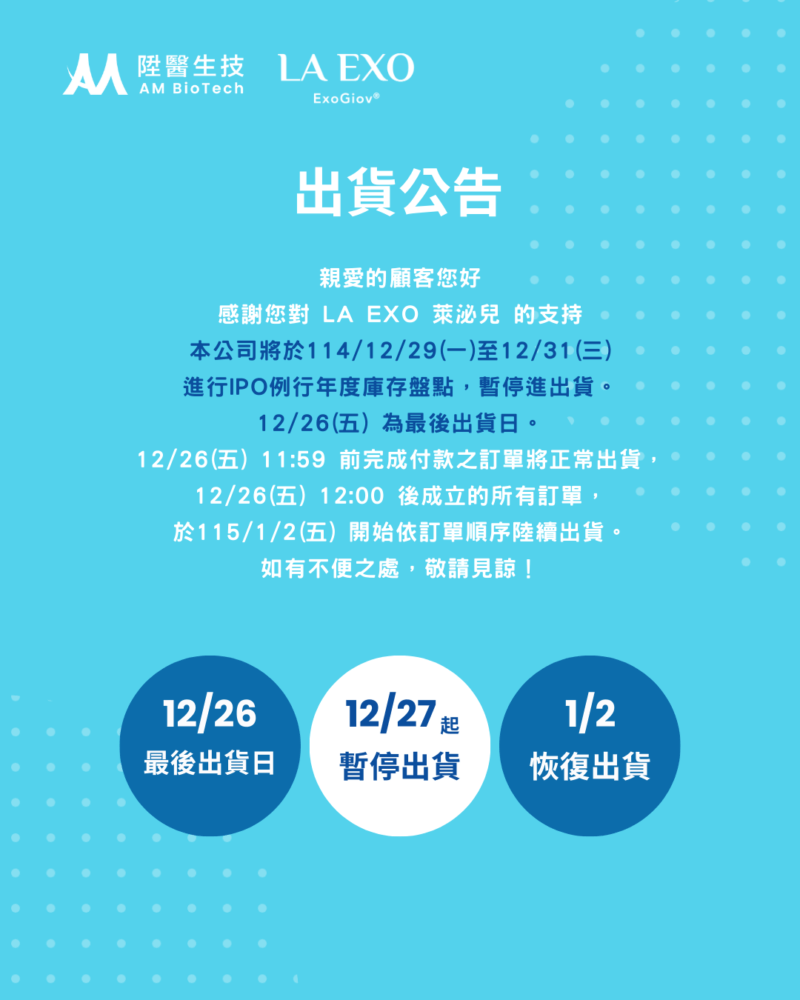 因年度盤點,114/12/29–12/31將暫停出貨,115/1/2恢復正常出貨作業。