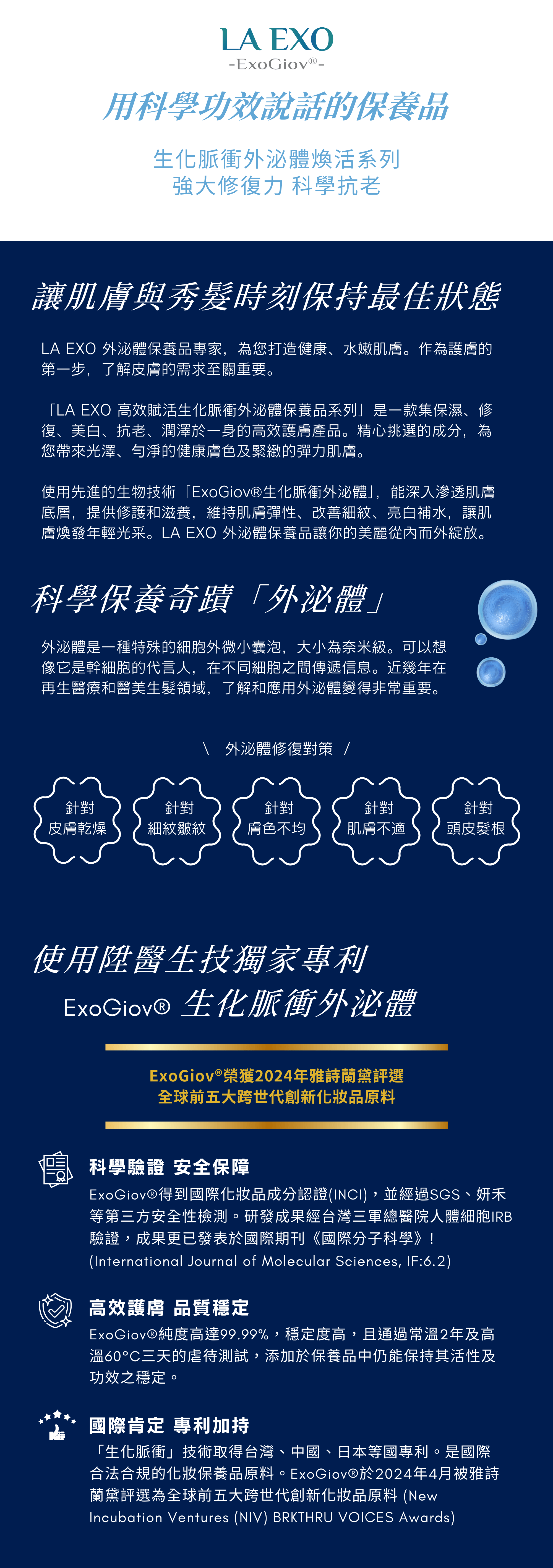 (LA EXO 品牌系列產品係由美國Emosoxe Biotech International L.L.C. 授權陞醫生物科技股份有限公司製造)