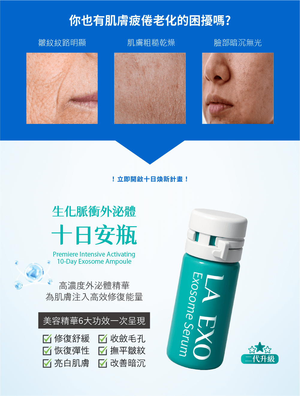 高濃度外泌體精華,加速修復肌膚、重現緊緻光澤、保濕彈潤、高效抗老撫紋