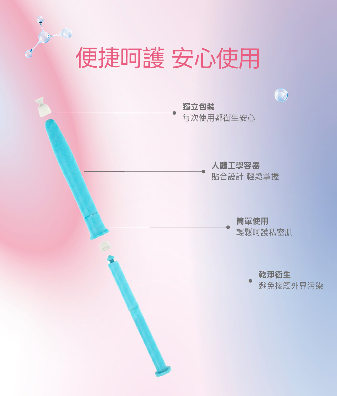 【注意事項】包裝瓶器為一次性包材,請避免重複使用造成感染風險。生理期或孕期建議暫停使用。若肌膚有傷口或敏感不適,請停止使用並諮詢專業人員。建議於沐浴後、睡前使用,靜躺休息片刻,讓私密肌膚獲得最溫柔的呵護。